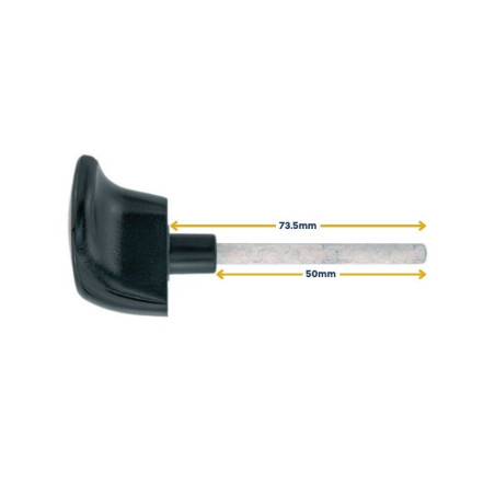 Poignée ronde extérieure et en T intérieure avec carré de 9x9 et longueur de tige 73.5mm pour portes basculantes.