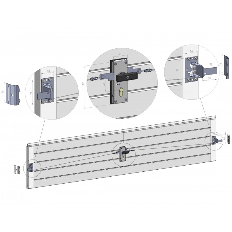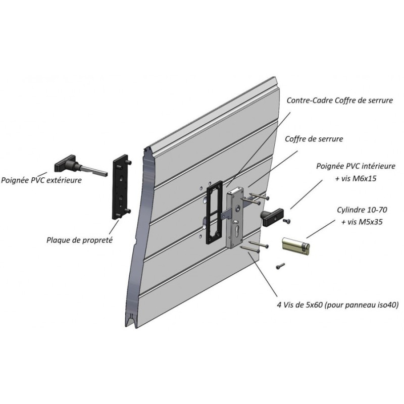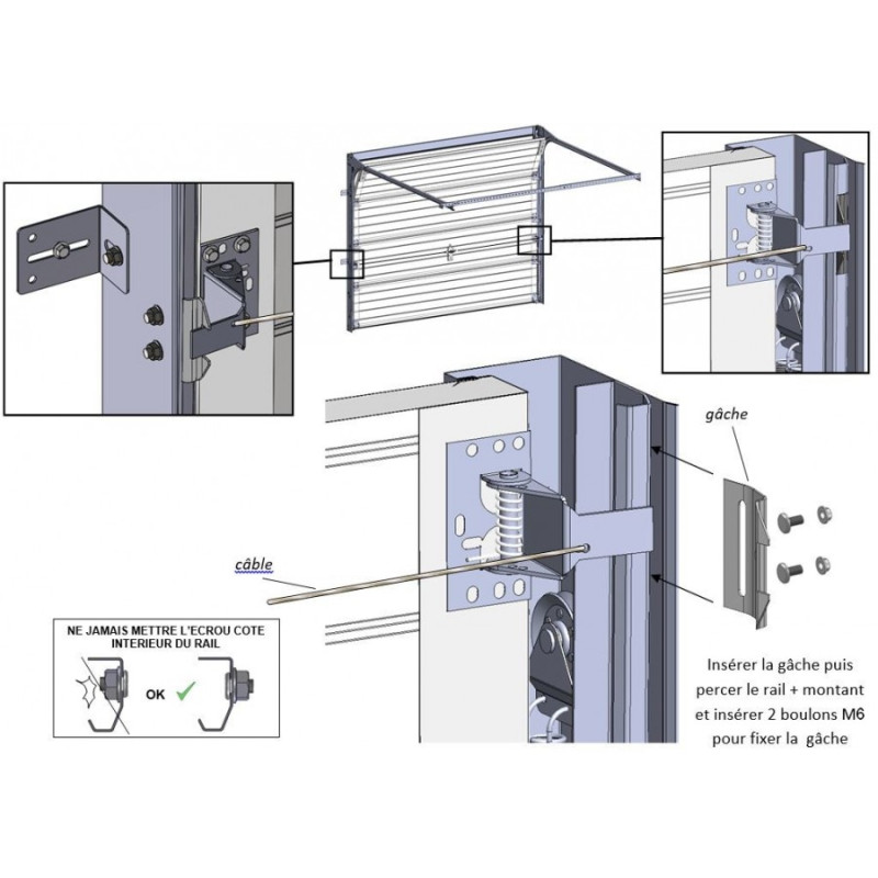Cet ensemble permet la fermeture de votre porte sectionnelle non motorisée à l'aide d'un câble relié à la serrure qui déclenche les verrous latéraux.
