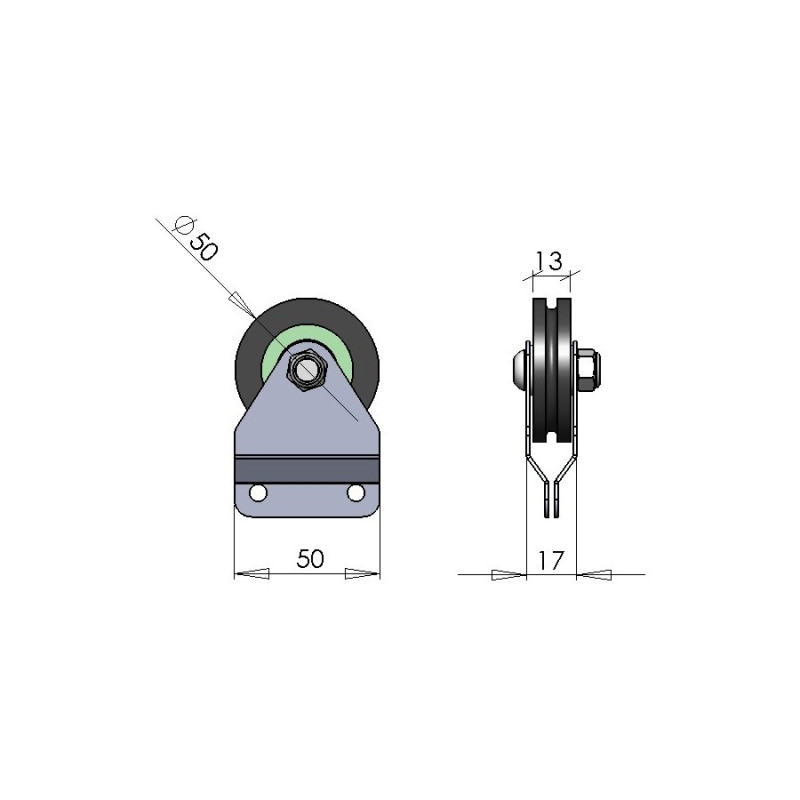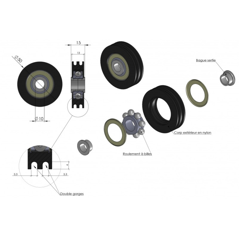 Poulie mobile 2 trous en nylon de diamètre 50mm pour ressort de traction de porte de garage sectionnelle.