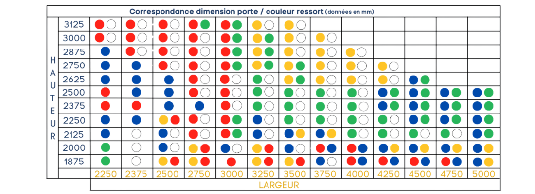 Retrouvez dans la description les dimensions de portes compatibles avec le ressort BLEU et avec toutes les autres couleurs de ressorts